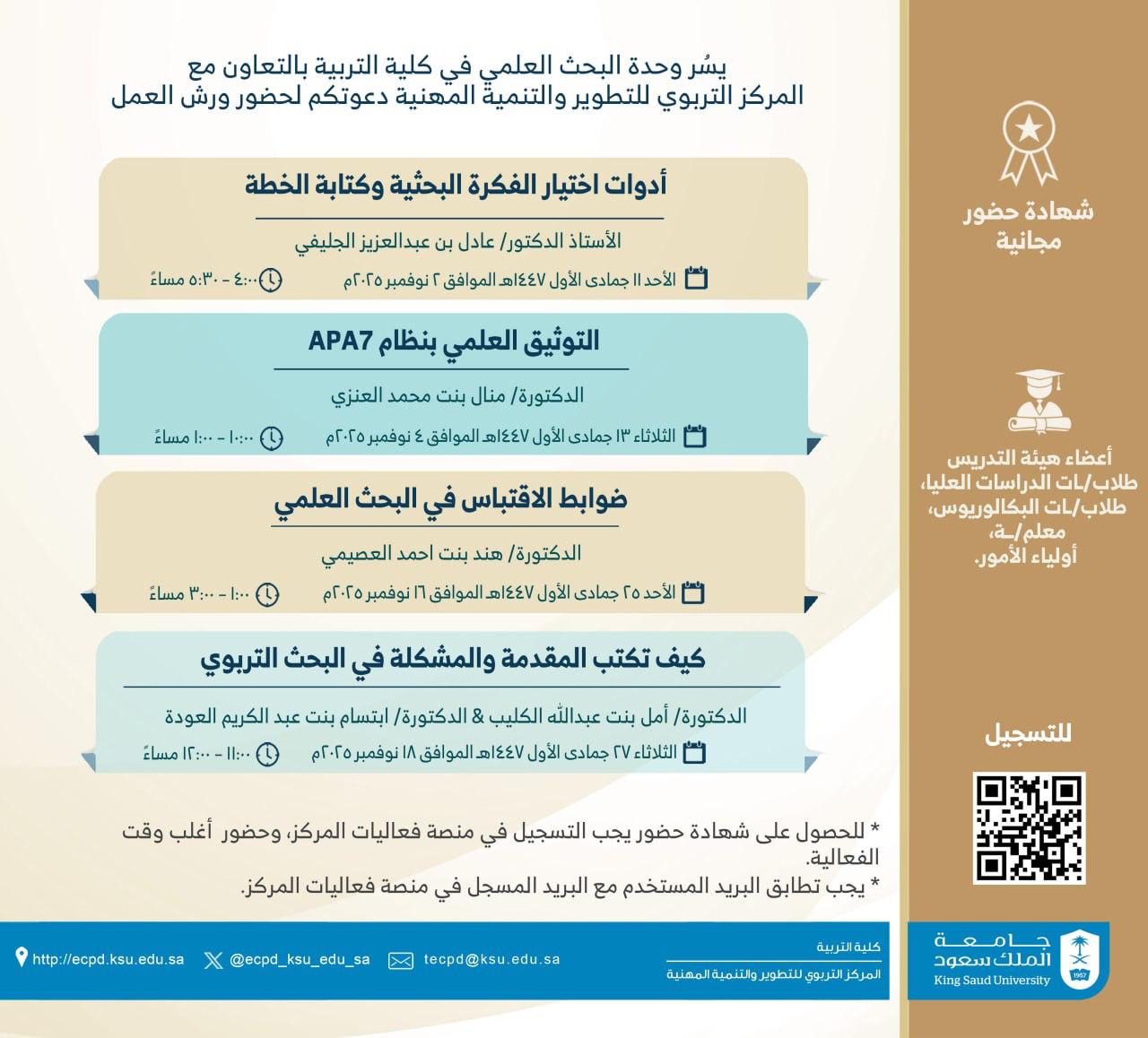 يسُر وحدة البحث العلمي بالتعاون مع المركز التربوي للتطوير والتنمية المهنية في كلية التربية دعوتكم لحضور ورش عمل يقدمها نخبة من أعضاء