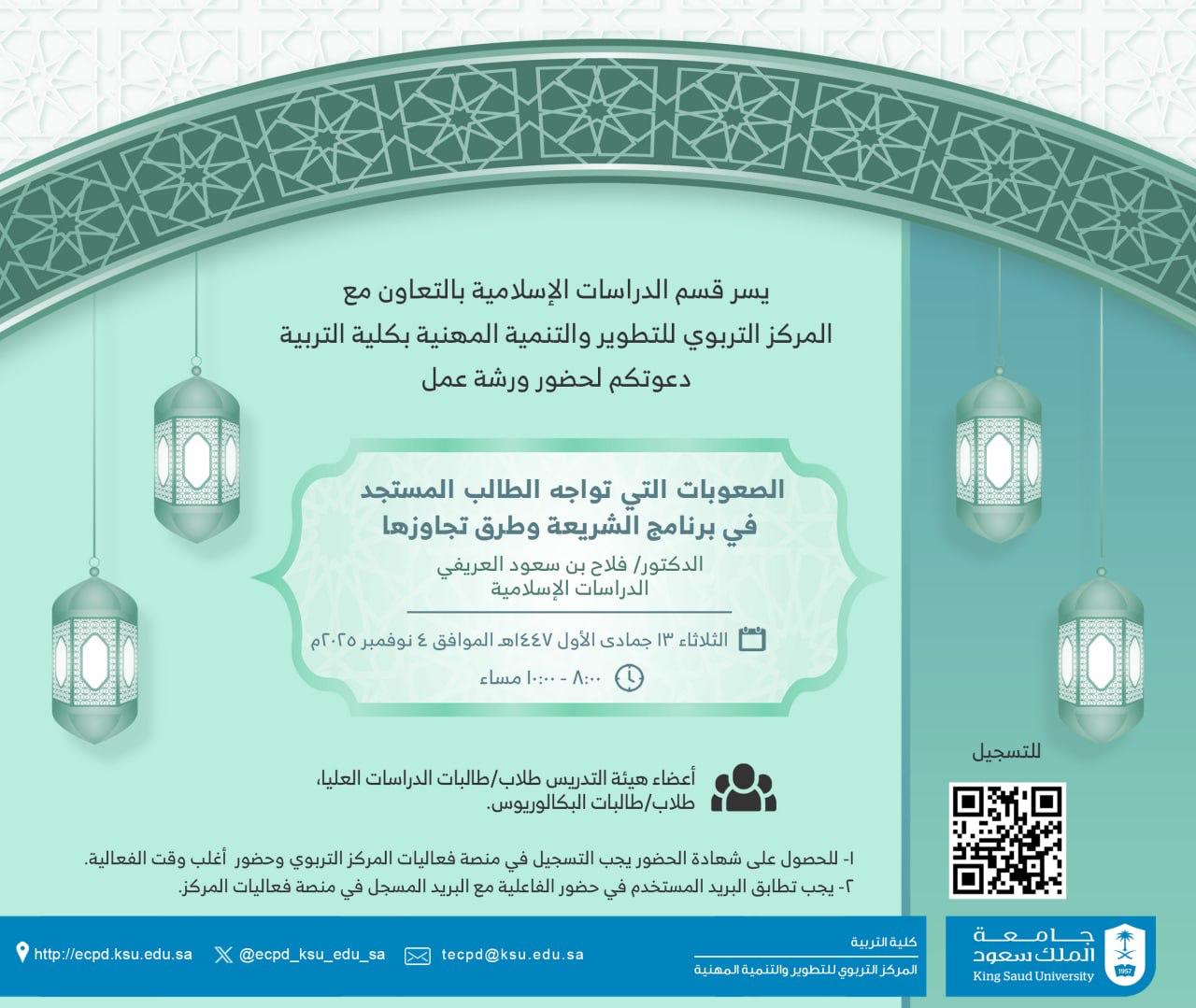 يسر قسم الدراسات الإسلامية بالتعاون مع المركز التربوي للتطوير والتنمية المهنية في كلية التربية دعوتكم لحضور ورشة عمل: 🔶 الصعوبات التي تواجه الطالب