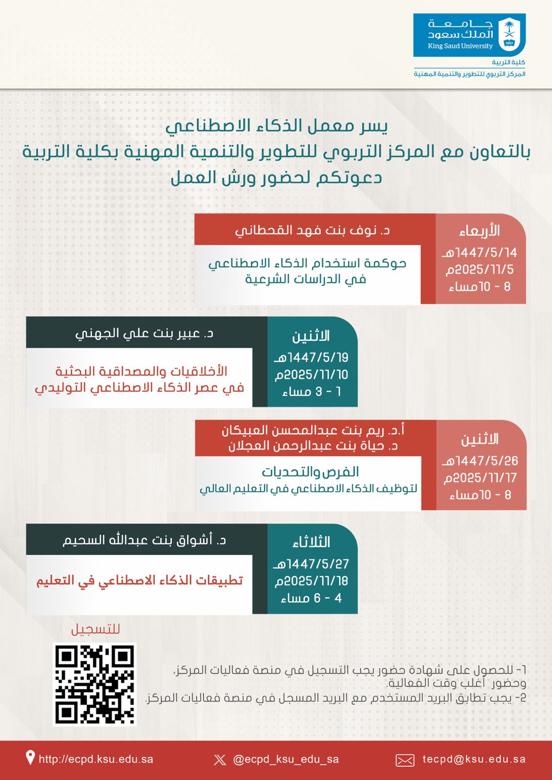 يسر معمل الذكاء الاصطناعي بالتعاون مع المركز التربوي للتطوير والتنمية المهنية بكلية التربية دعوتكم لحضور ورش عمل يقدمها نخبة من أعضاء هيئة