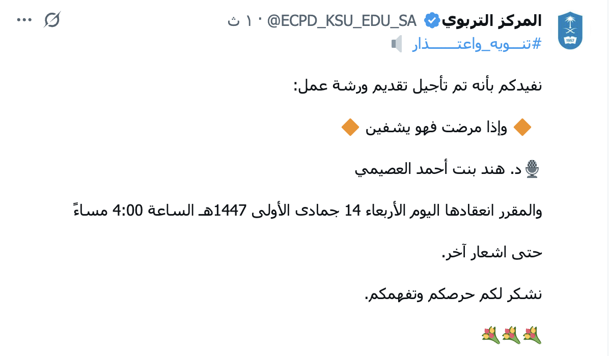 #تنـــويه_واعتـــــــذار 🔈 نفيدكم بأنه تم تأجيل تقديم ورشة عمل: 🔶 وإذا مرضت فهو يشفين 🔶 🎙د. هند بنت أحمد العصيمي والمقرر انعقادها اليوم