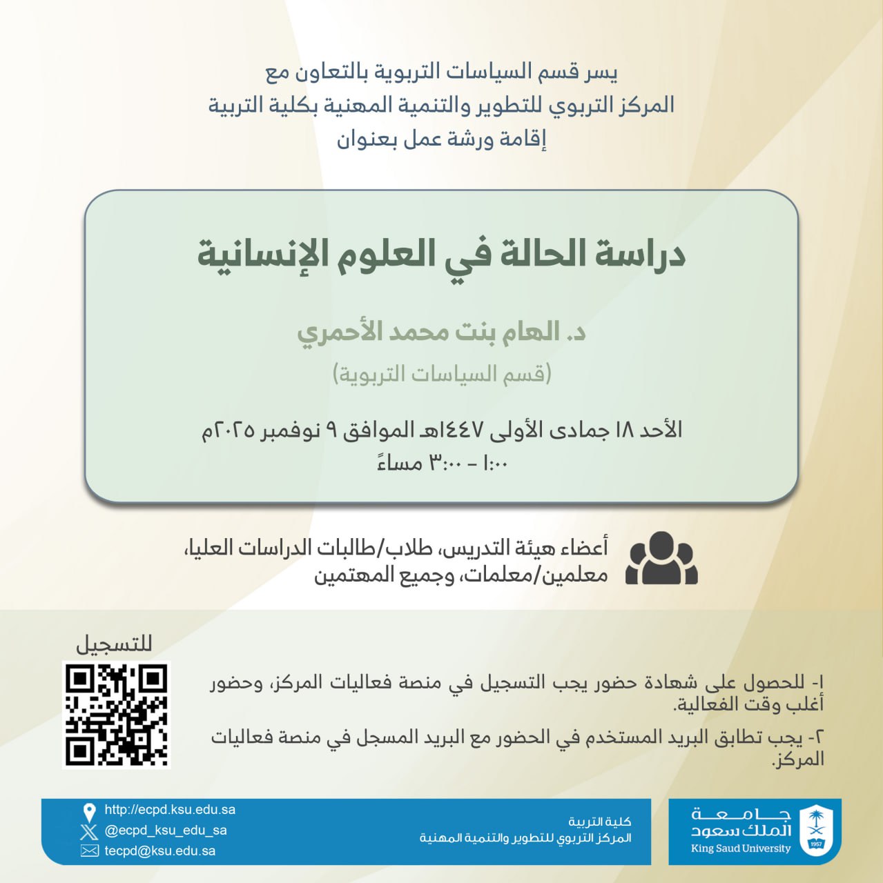 يسر قسم السياسات التربوية بالتعاون مع المركز التربوي للتطوير والتنمية المهنية بكلية التربية دعوتكم لحضور ورشة عمل: 🔶 دراسة الحالة في العلوم الإنسانية