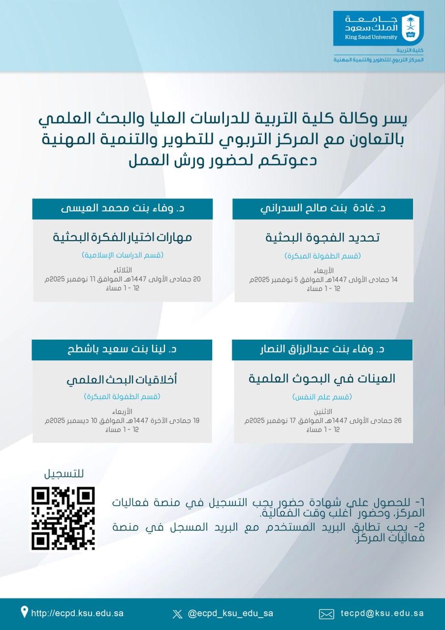 يسر وكالة كلية التربية للدراسات العليا والبحث العلمي بالتعاون مع المركز التربوي للتطوير والتنمية المهنية دعوتكم لحضور ورش عمل يقدمها نخبة من
