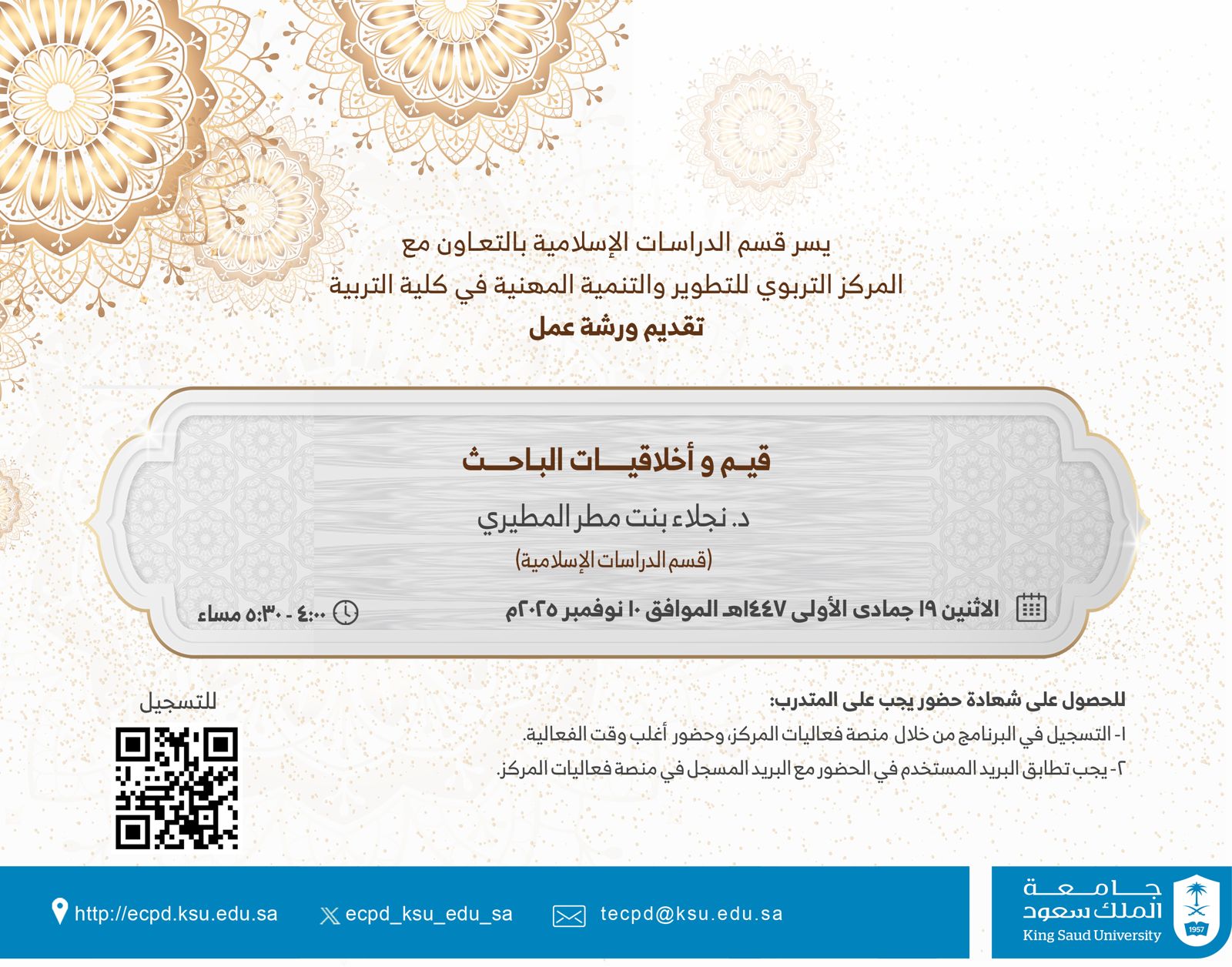 يسر قسم الدراسات الإسلامية بالتعاون مع المركز التربوي للتطوير والتنمية المهنية بكلية التربية دعوتكم لحضور ورشة عمل: 🔶 قيم وأخلاقيات الباحث 🔶 🎙د. نجلاء