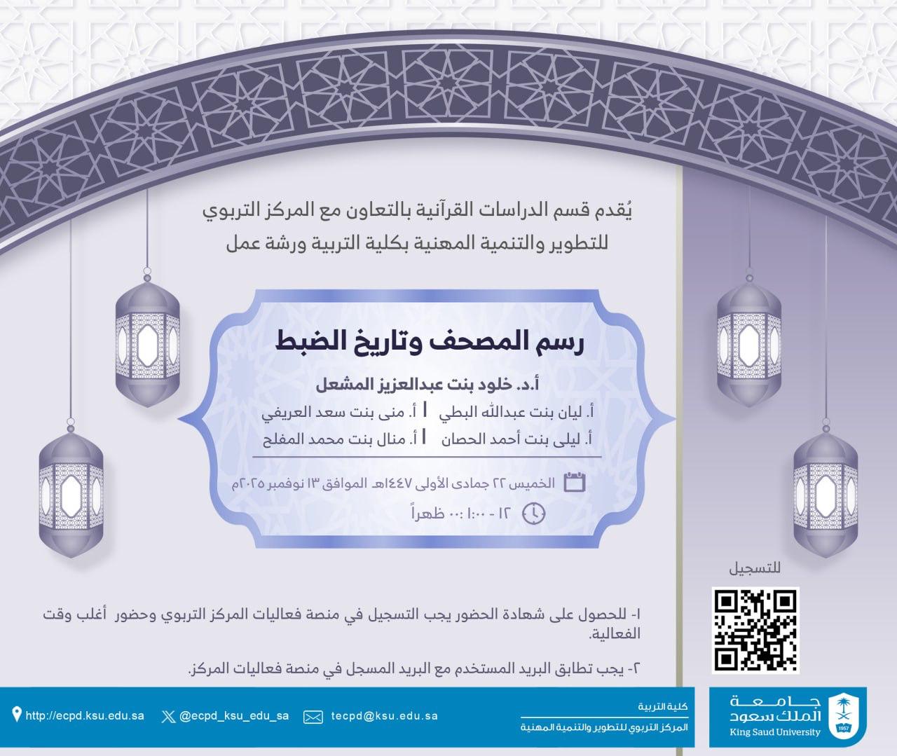 يقدم قسم الدراسات القرآنية بالتعاون مع المركز التربوي للتطوير والتنمية المهنية بكلية التربية ورشة عمل: 🔶 رسم المصحف وتاريخ الضبط 🔶 🎙أ.د خلود بنت
